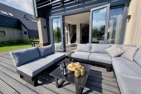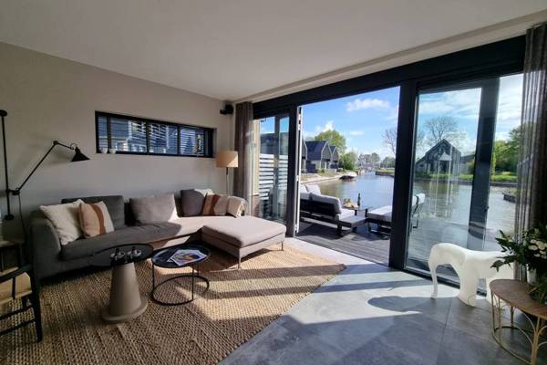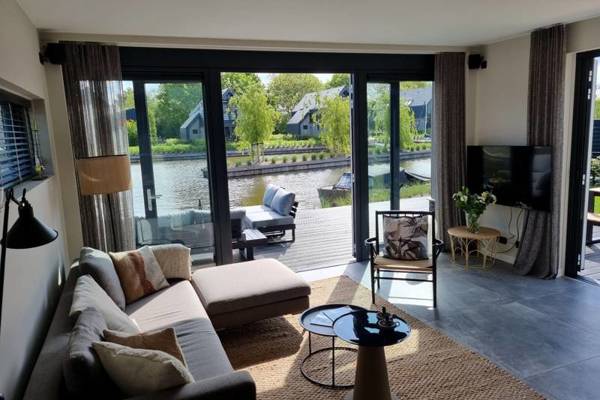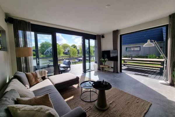 De watervilla beschikt over een ruime woonkamer met comfortabele zithoek, Smart tv en een ruime eettafel.