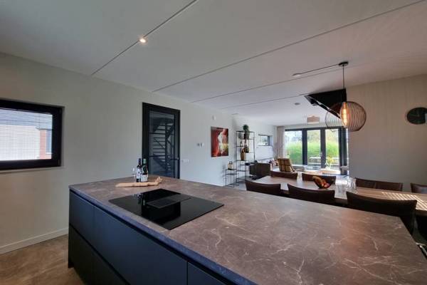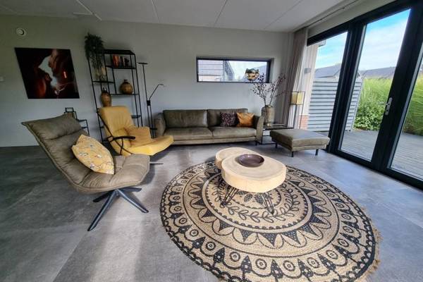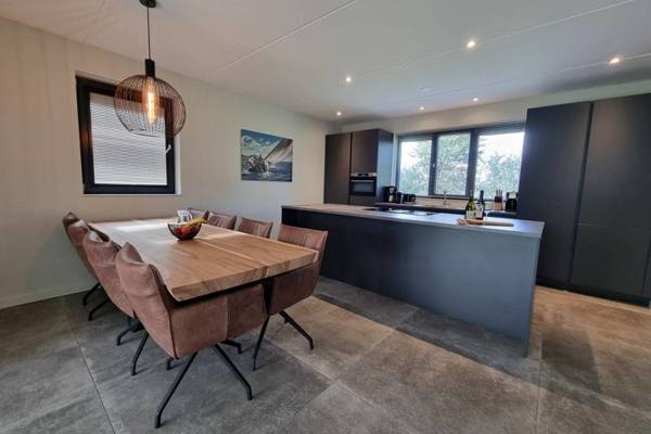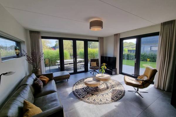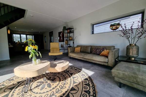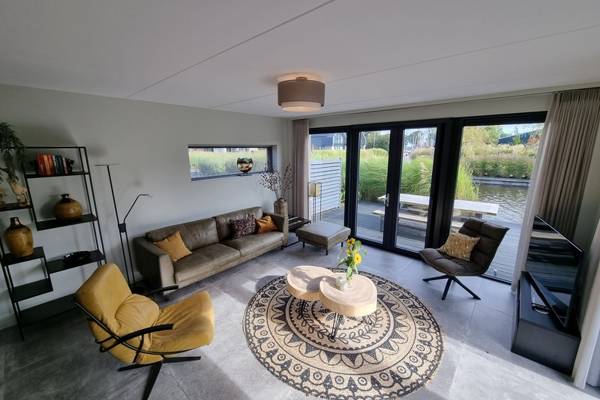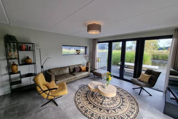 De watervilla beschikt over een XXL living met comfortabele zithoek, Smart tv, en een ruime eettafel.