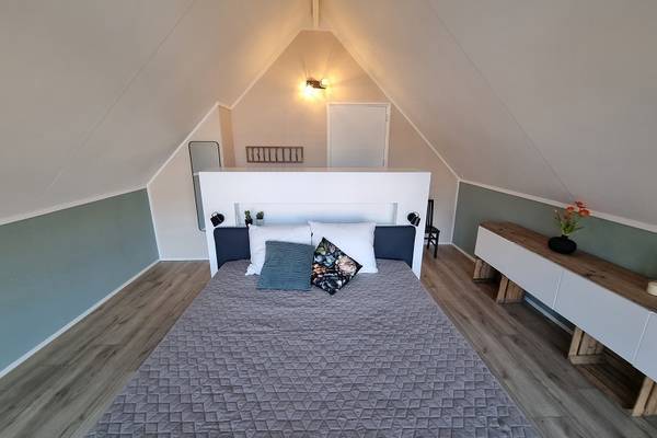 De eerste verdieping, die middels een trap vanuit de woonkamer kan worden betreden, beschikt over 2 slaapkamers: de hoofdslaapkamer met tweepersoons boxspring; slaapkamer met tweepersoonsbed. Grote badkamer met ligbad, inloopdouche, wastafel en toilet.