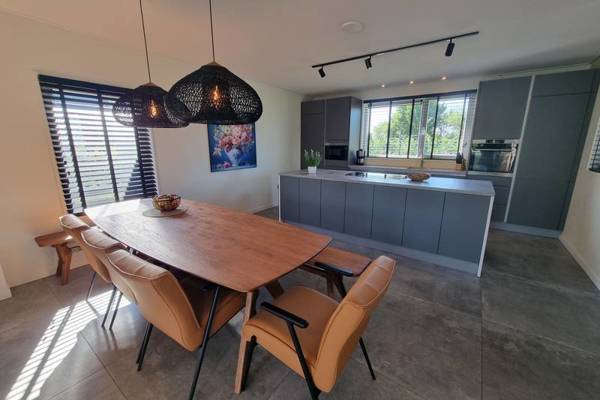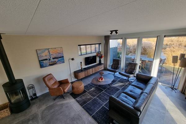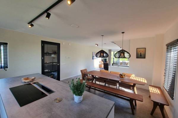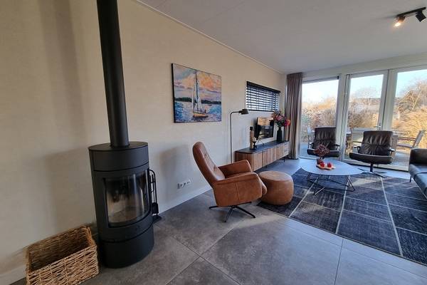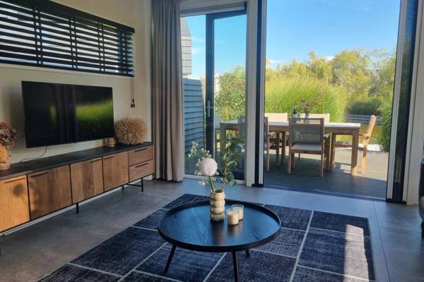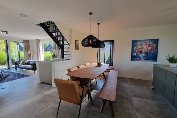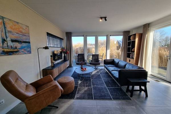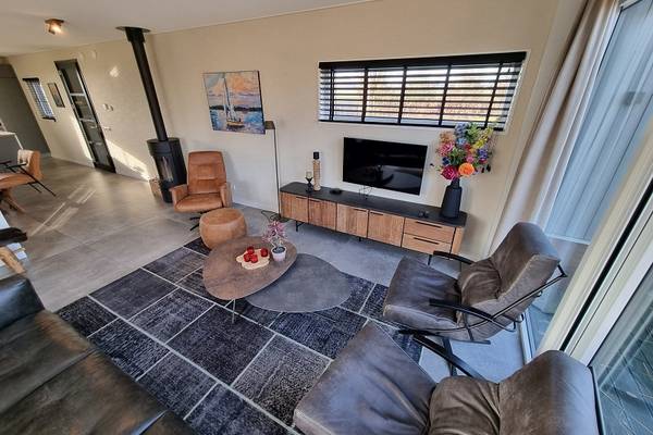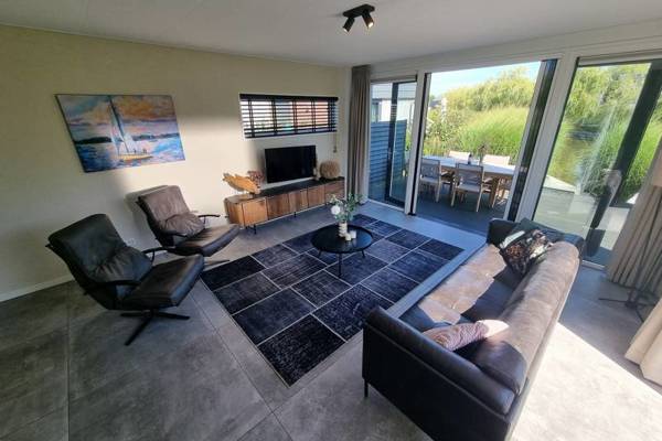 De watervilla beschikt over een XXL living met comfortabele zithoek, Smart tv, en een ruime eettafel.