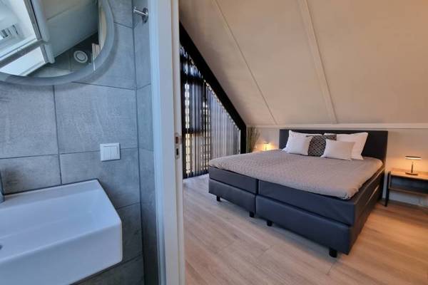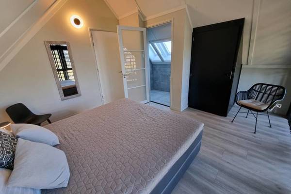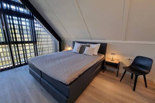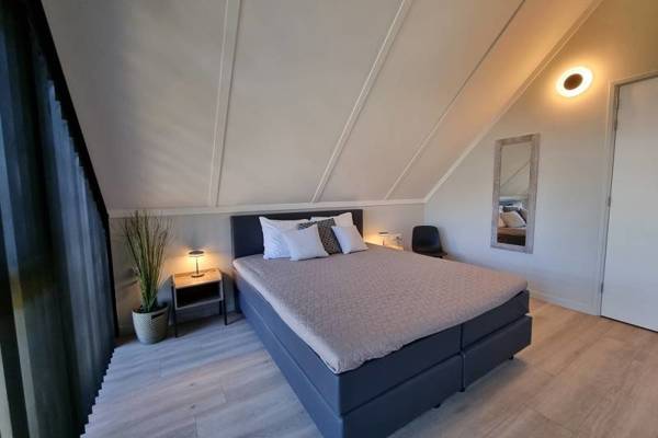 De eerste verdieping, die middels een trap vanuit de woonkamer kan worden betreden, beschikt over 3 slaapkamers: de hoofdslaapkamer met tweepersoons boxspring en badkamer ensuite; slaapkamer met tweepersoons boxspring; slaapkamer met 1 halfhoogslaper en 1 persoonsbed. Tevens een tweede badkamer met inloopdouche, wastafel en separaat toilet.