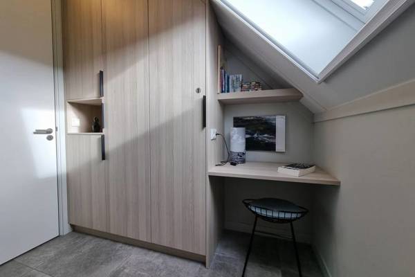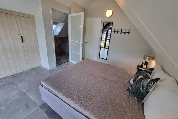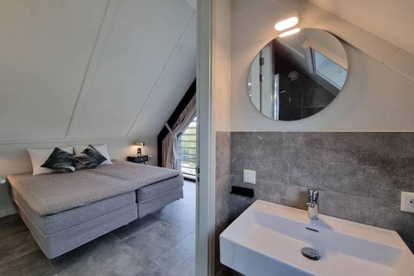 Additionally, on the first floor you will find a bedroom with double box spring and ensuite bathroom, equipped with a walk-in shower and separate sink. The toilet is separate at the entrance.