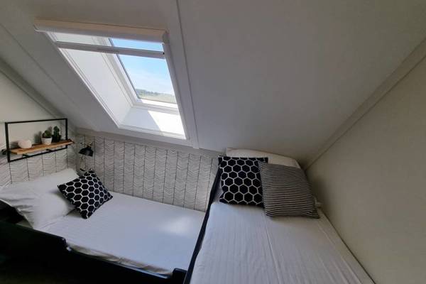 De eerste verdieping, die middels een trap vanuit de woonkamer kan worden betreden, beschikt over 3 slaapkamers: de hoofdslaapkamer met tweepersoons boxspring met badkamer ensuite; slaapkamer met tweepersoons boxspring; slaapkamer met 1 halfhoogslaper en 1 persoonsbed. Tevens een tweede badkamer met inloopdouche, wastafel en separaat toilet.