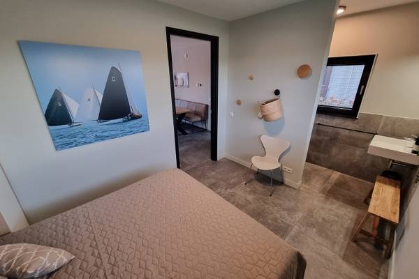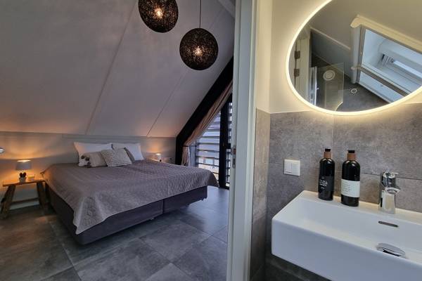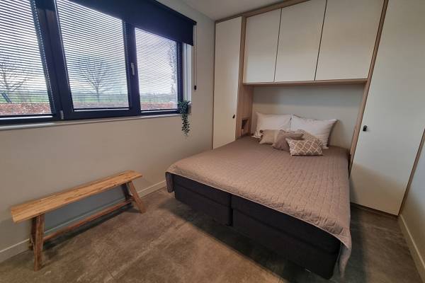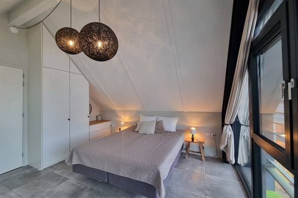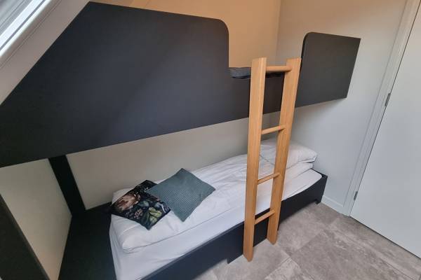De eerste verdieping, die middels een trap vanuit de woonkamer kan worden betreden, beschikt over 3 slaapkamers: de hoofdslaapkamer met tweepersoons boxspring en badkamer ensuite; slaapkamer met tweepersoons boxspring; slaapkamer met stapelbed. Tevens een tweede badkamer met inloopdouche, wastafel en separaat toilet.