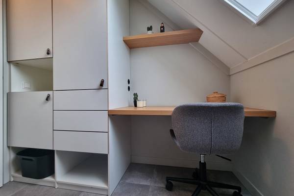 Tevens vindt u op de begane grond een slaapkamer met tweepersoonsboxspring en badkamer ensuite, voorzien van een inloopdouche en aparte wastafel. Het toilet is separaat bij de entree.