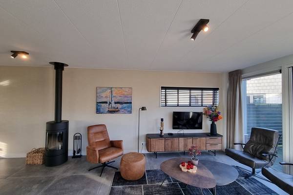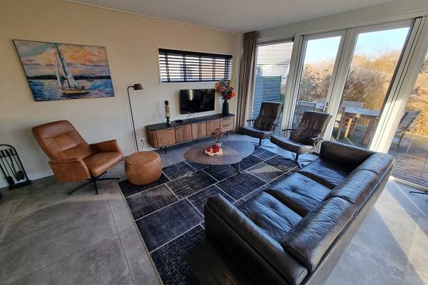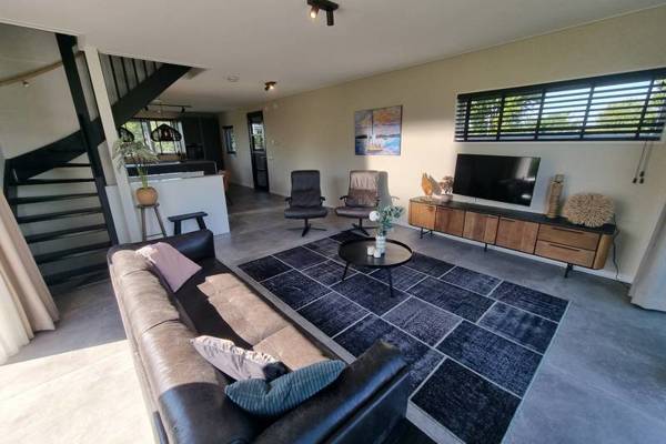 De watervilla beschikt over een XXL living met comfortabele zithoek, Smart tv, en een ruime eettafel.